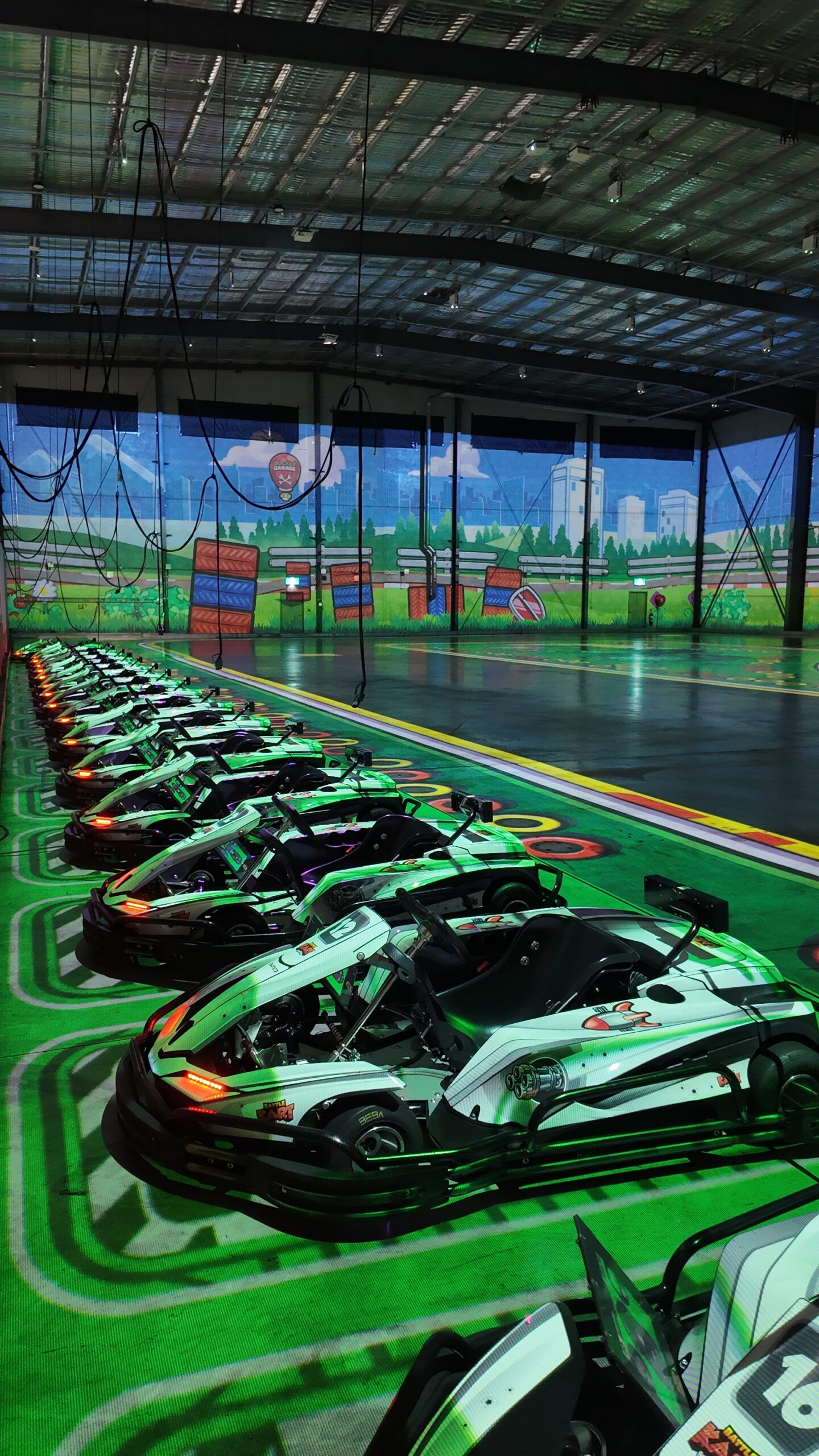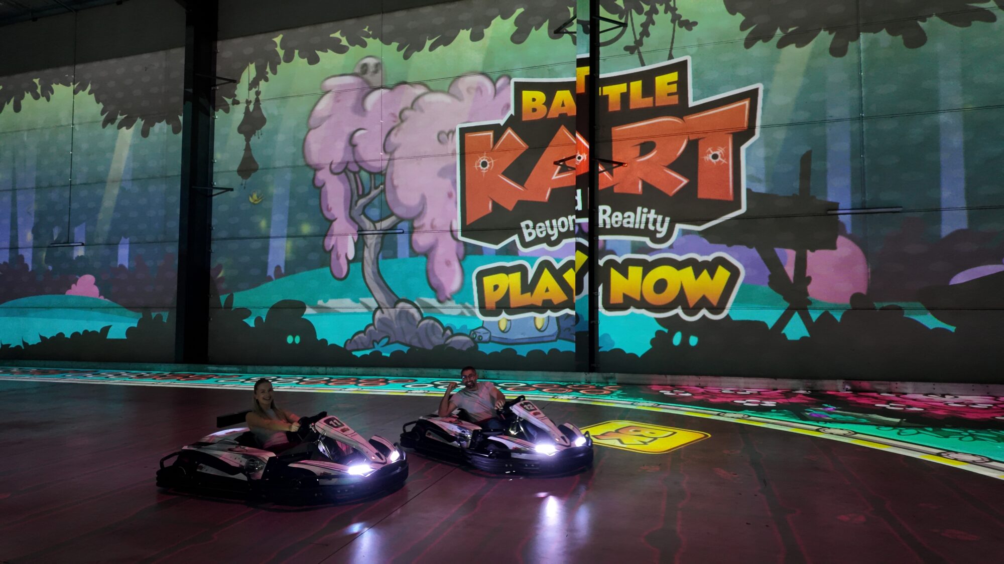BattleKart isn’t your typical race track. There are no cones or tyres or dusty corners to drift around. Instead, you’re driving real electric go-karts across a flat, open track — but everything else, from the racetrack to the rules, is projected onto the ground. It’s weird and a little surreal, like stepping into a digital playground.